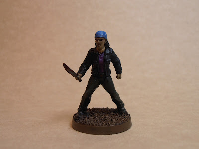 Sandra is my favorite of the models apart from Rick. I like the pragmatism of the figure. She is a runner wearing leather for protection, cargo pants for mobility and a bandana to keep the hair out of her eyes. More of a flee than fight character the knife is a sensible desperation weapon I gored up a bit to show she uses it for stabbing not slashing. I painted her skin with an olive hue because I thought it suited her high cheekbones and hawkish nose. She looks tough and competent; I hope she lives.
