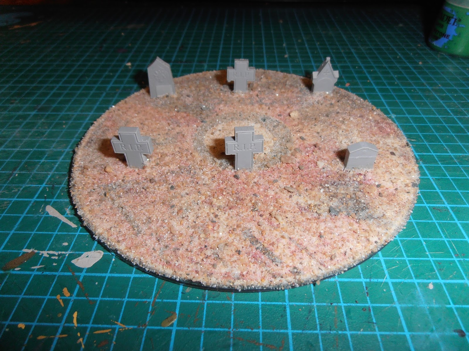 Next, I painted a thin layer of glue across the the surface of each of the six discs. I didn't bother with model paste or anything to build up the groundwork. Graveyards are usually heavily landscaped so it was fine for the earth to be level. Once the bases dried they were primed.